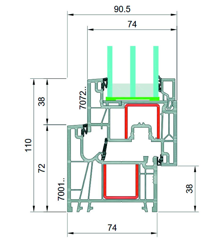 La tecnología de 74 mm, el último desarrollo en el segmento de 70 mm, asegura una alta estabilidad con modernos vidrios funcionales y, gracias al diseño multicámara, proporciona más seguridad, aislamiento acústico y térmico. La universalidad del sistema culmina con el diseño rectilíneo, siguiendo así la tendencia minimalista de la arquitectura moderna.